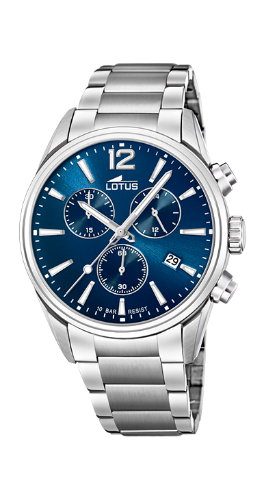 RELOJ DE CABALLERO LOTUS , CAJA DE ACERO DE 42MM, CRISTAL MINERAL, FUNCION CRONOMETRO, ESFERA AZUL, ESTANQUEIDAD 5ATM.
