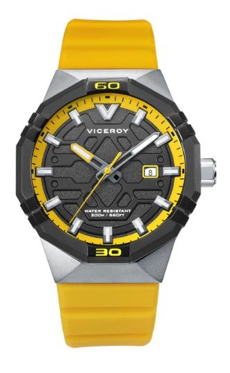 RELOJ DE CABALLERO VICEROY, CAJA BITONO DE ACERO IP NEGRO 42MM, CRISTAL MINERAL, ESFERA NEGRA, ESTANQUEIDAD 20ATM, CORREA DE SILICONA AMARILLA.